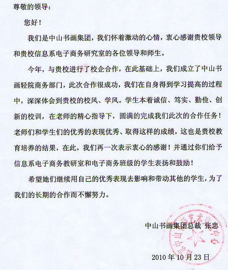 近日,我院周大農(nóng)院長收到了我院信息系校企合作單位——中山書畫集團(tuán)的一封感謝信,信中,中山書畫集團(tuán)對我院領(lǐng)導(dǎo)和信息系電子商務(wù)專業(yè)師生表示感謝,感謝學(xué)院領(lǐng)導(dǎo)、教師的辛勤栽培,感謝學(xué)院電子商務(wù)專業(yè)學(xué)生的踏實勤奮的工作態(tài)度。