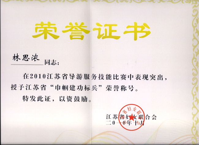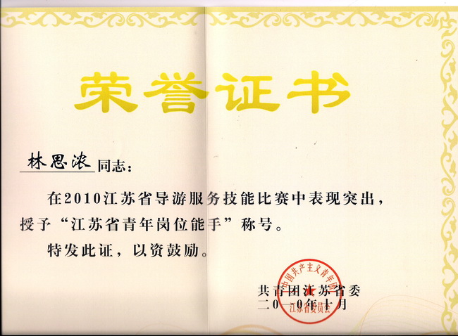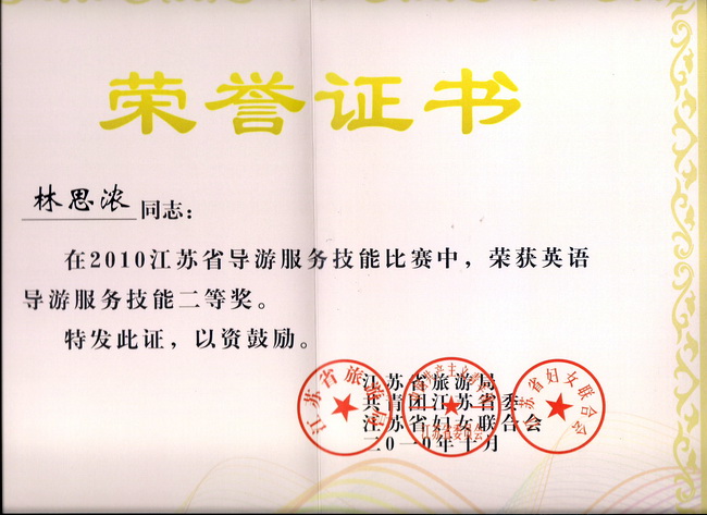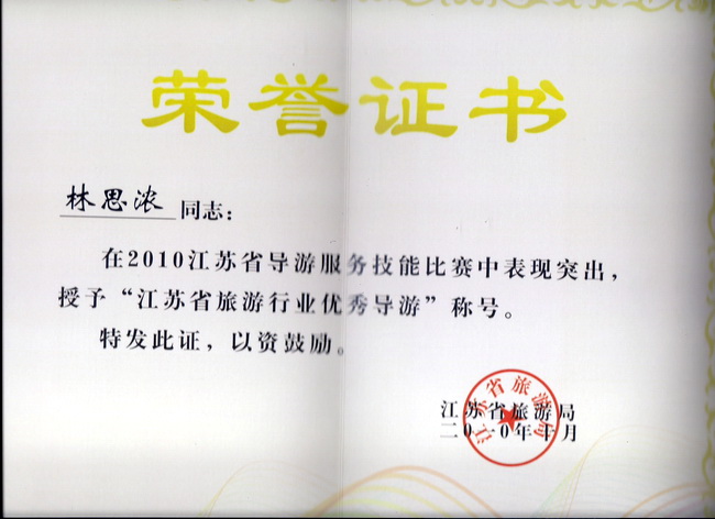 本次導(dǎo)游技能大賽是我省歷屆以來覆蓋面最廣、規(guī)格最高、影響最廣的大型導(dǎo)游服務(wù)賽事。大賽歷時兩天,分為導(dǎo)游風采、導(dǎo)游講解、知識問答、才藝展示等多個賽程。進入全省決賽的78位選手來自江蘇各家旅游企事業(yè)單位、高等院校和其他單位,他們均是各市預(yù)賽中的佼佼者。常州市此次共選派6位選手參賽,其中二位是我院畢業(yè)生徐少飛和張劍,一位是我院08級在校生林思濃。經(jīng)過緊張的角逐,我院學生林思濃獲得英文組二等獎,并同時獲得省團委頒發(fā)的“江蘇省青年崗位能手”、省婦聯(lián)頒發(fā)的“巾幗建功標兵”、省旅游局頒發(fā)的“江蘇省優(yōu)秀導(dǎo)游員”榮譽證書;張劍獲得中文組三等獎,獲省旅游局頒發(fā)的“江蘇省優(yōu)秀導(dǎo)游員”榮譽證書。