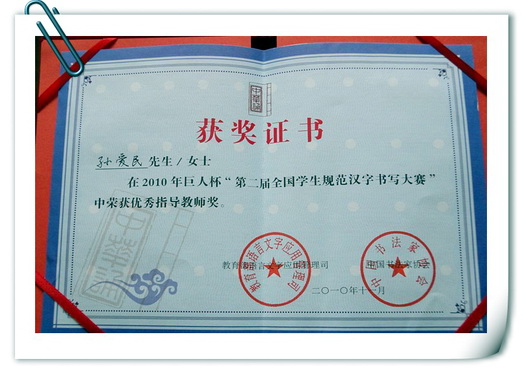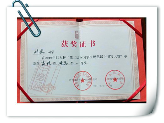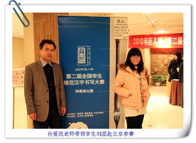 本次大賽設(shè)小學(xué)一組、小學(xué)二組、初中組、高中組、中職組、高校組、港澳臺(tái)僑組、留學(xué)生組,共八個(gè)組別,分軟筆、硬筆兩大系列。我院藝術(shù)系09廣告631班劉蕊同學(xué)代表江蘇高校赴北京參賽,在孫愛民老師精心指導(dǎo)下,劉蕊同學(xué)獲高校組硬筆書法比賽一等獎(jiǎng)(江蘇高職院校唯一的“一等獎(jiǎng)”)。大賽高校組共產(chǎn)生39個(gè)“一等獎(jiǎng)”(軟筆、硬筆),江蘇高校共有四人獲一等獎(jiǎng)。我院孫愛民老師獲第二屆全國學(xué)生規(guī)范漢字書寫大賽優(yōu)秀指導(dǎo)教師獎(jiǎng)。在北京頒獎(jiǎng)晚會(huì)期間,劉蕊同學(xué)接受了中央教育電視臺(tái)報(bào)道組的記者的采訪。我院09成型631李佳、09造型331李方圓同學(xué)獲高校組硬筆書法三等獎(jiǎng)。