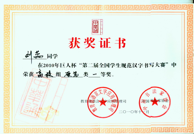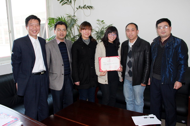 獲得第二屆全國學(xué)生規(guī)范漢字書寫大賽高校組一等獎(jiǎng)的藝術(shù)設(shè)計(jì)系09廣告331班的劉蕊同學(xué)以及三等獎(jiǎng)獲得者09造型331班李方圓同學(xué)載譽(yù)歸來,藝術(shù)設(shè)計(jì)系黨總支金培珍書記、方四文主任、檀祝平副書記于11月18日在工訓(xùn)樓109室親切接見了他們及其指導(dǎo)老師孫愛民副教授。獲獎(jiǎng)學(xué)生及其指導(dǎo)老師與藝術(shù)設(shè)計(jì)系領(lǐng)導(dǎo)進(jìn)行了座談。