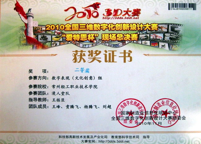 2010全國三維數(shù)字化創(chuàng)新設(shè)計大賽總決賽結(jié)果日前揭曉,我院藝術(shù)設(shè)計系動漫社團(tuán)“漫人堂”團(tuán)隊以特等獎身份代表江蘇省參加全國總決賽,在總決賽中獲得全國二等獎,在本次總決賽數(shù)字文化創(chuàng)意表現(xiàn)組中,是江蘇省唯一以角色動畫短片獲得此獎項的學(xué)校。