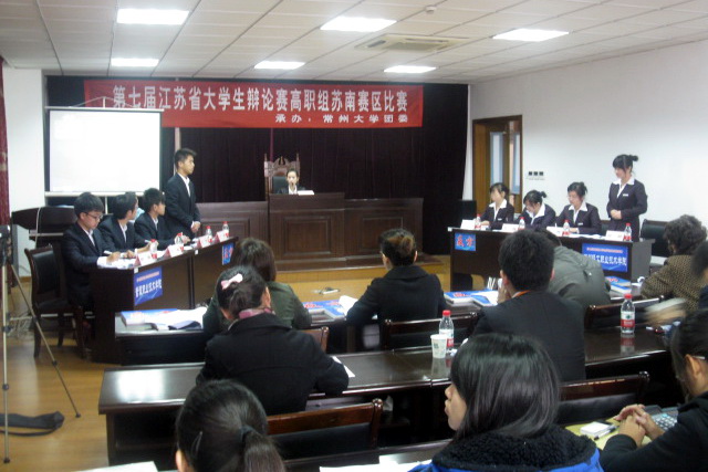 辯論賽分預(yù)賽、復(fù)賽、半決賽、決賽。我院辯論隊每場辯論均逢本科院校,在預(yù)賽上與常州工學(xué)院就“大學(xué)生談戀愛利弊”問題進(jìn)行辯論,最終淘汰了常州工學(xué)院進(jìn)入復(fù)賽。在復(fù)賽上又與常州大學(xué)就“大學(xué)生因多而廣還是少而精的交友”問題進(jìn)行辯論,最終力克常州大學(xué)進(jìn)入半決賽。在半決賽上,我院與江蘇技術(shù)師范學(xué)院相遇,雙方就“網(wǎng)絡(luò)使人疏遠(yuǎn)還是親近”的問題進(jìn)行唇槍舌辯,最終獲季軍。