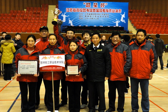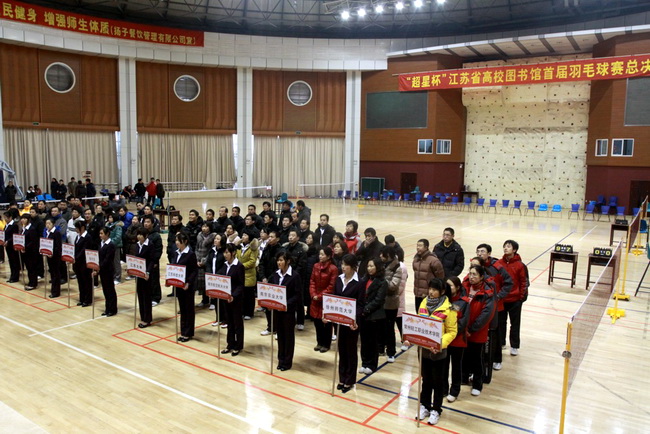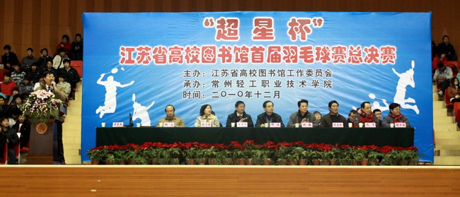 由江蘇省高校圖工委主辦、常州輕工職業(yè)技術(shù)學(xué)院承辦的“超星杯”江蘇省高校圖書館首屆羽毛球總決賽于2010年12月25日在常州輕工職業(yè)技術(shù)學(xué)院體育館拉開帷幕。開幕式由江蘇省高校圖工委隊(duì)伍建設(shè)與職業(yè)素養(yǎng)委員會主任周愛民同志主持。省高校圖工委領(lǐng)導(dǎo)邵波、我校副院長王志平分別致辭。南京理工大學(xué)趙敏館長、淮陰師范學(xué)院郭啟松館長、金陵科技學(xué)院劉阿多館長、南京工業(yè)大學(xué)趙乃瑄館長及各代表隊(duì)領(lǐng)導(dǎo)出席了開幕式,裁判員閆小虎代表全體裁判員宣誓、運(yùn)動員葉茂代表全體運(yùn)動員宣誓。本次總決賽是由五個分賽區(qū)四十多支隊(duì)伍經(jīng)過激烈選拔,決出十二支優(yōu)秀的隊(duì)伍參加。比賽分為男單、女單、男女混雙3個項(xiàng)目。比賽既為羽毛球運(yùn)動愛好者提供了切磋球藝的機(jī)會,也為高校間交流溝通搭建了平臺。