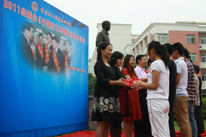同學(xué)們,以鄧建軍精神為核心的學(xué)校文化是我院獨(dú)具特色的文化,是我們?nèi)w同學(xué)成長(zhǎng)成才的精神港灣。今天,我們?cè)卩嚱ㄜ娝芟袂奥≈嘏e行《中國(guó)技工鄧建軍》的發(fā)授儀式,就是要引領(lǐng)2011級(jí)新生從此走上鄧建軍式的成才之路,讓大家親近鄧建軍、感受鄧建軍、學(xué)習(xí)鄧建軍、爭(zhēng)做鄧建軍,象鄧建軍那樣去學(xué)習(xí),象鄧建軍那樣去鉆研,象鄧建軍那樣去苦練技能,象鄧建軍那樣去成才。希望2011級(jí)新生認(rèn)真閱讀《中國(guó)技工鄧建軍》,讓鄧建軍精神陪伴我們?nèi)昴酥僚惆槲覀冋麄€(gè)的人生。鄧建軍是我們常州輕工職業(yè)技術(shù)學(xué)院今天的驕傲,我們堅(jiān)信,站在鄧建軍象面前的2011級(jí)同學(xué)將成為我們輕工學(xué)院明天的驕傲!
