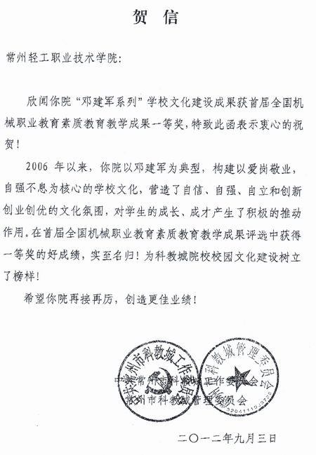 科教城管委會通過常州日報獲知我院獲獎消息后發(fā)來了賀信。