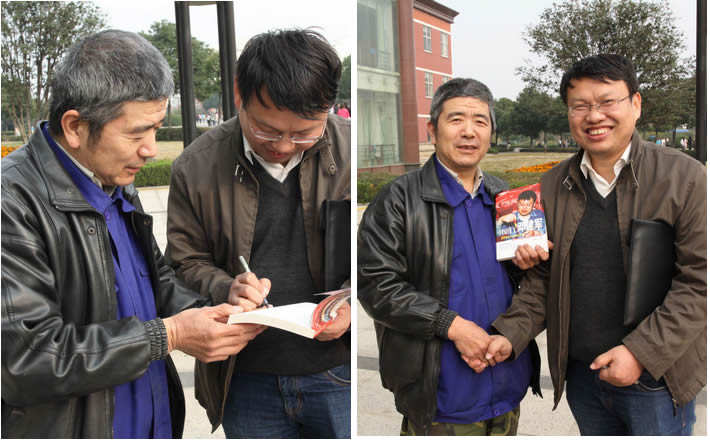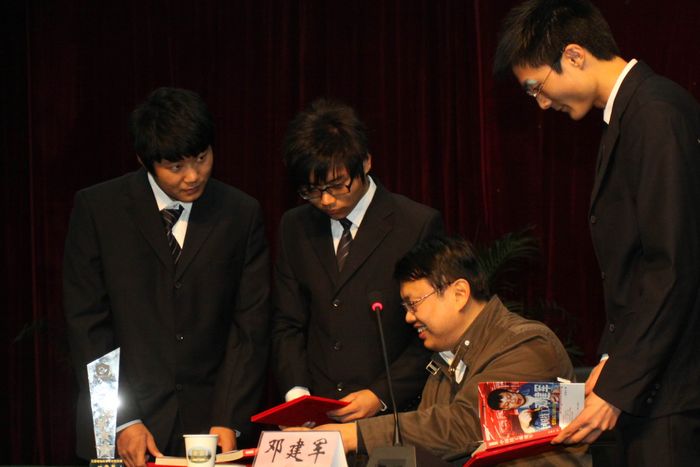 宣講會(huì)結(jié)束鄧建軍尚未離席,有三名同學(xué)沖上主席臺(tái)拿出《中國技工鄧建軍》一書要求簽名。十八大期間,三名同學(xué)參加江蘇省首屆信息安全技能競(jìng)賽,作為業(yè)余選手與本科院校的專業(yè)選手同臺(tái)競(jìng)技,獲得全省一等獎(jiǎng)。鄧建軍愉快地為他們簽名并合影留念。
