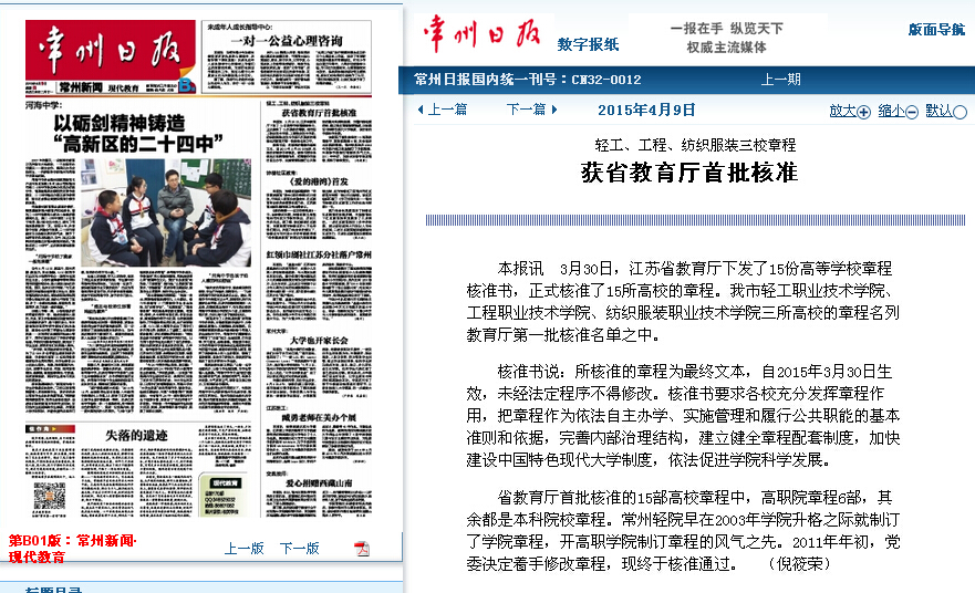 常州日報-輕工、工程、紡織服裝三校章程獲省教育廳首批核準