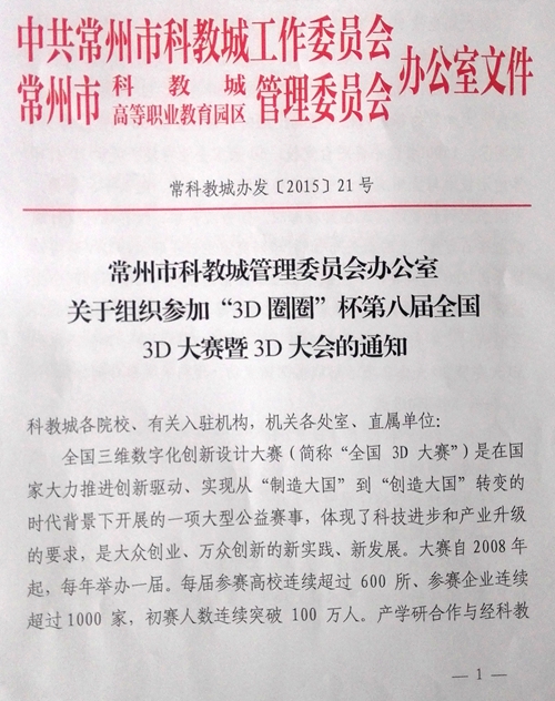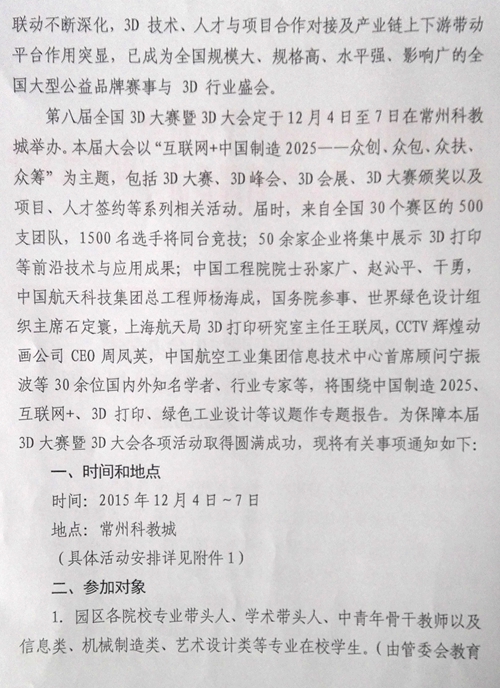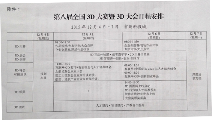 全國三維數(shù)字化創(chuàng)新設(shè)計(jì)大賽(簡稱“全國3D大賽”)定于2015年12月4日-7日在科教城舉行,如有感興趣的教師或?qū)W生可根據(jù)大會(huì)日程安排自行前往觀摩學(xué)習(xí)。