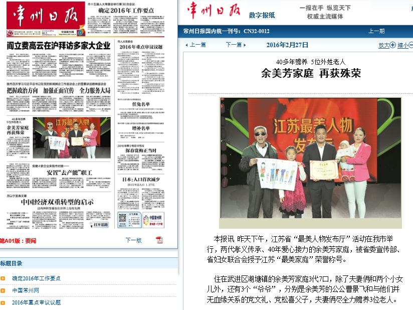 常州日?qǐng)?bào)-余美芳家庭 再獲殊榮