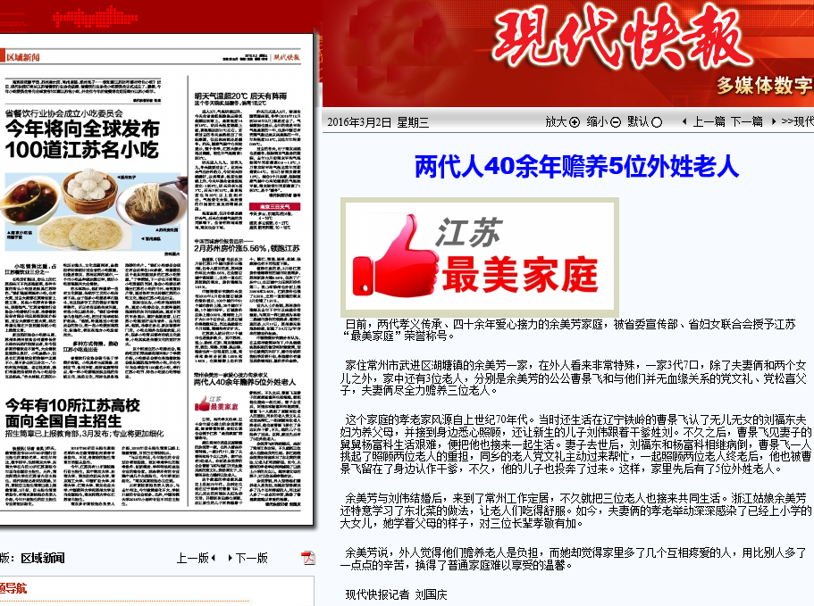 現(xiàn)代快報(bào)-兩代人40余年贍養(yǎng)5位外姓老人