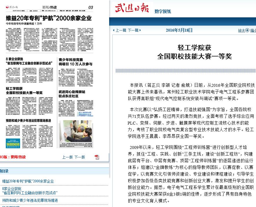 武進(jìn)日報(bào)-輕工學(xué)院獲全國職校技能大賽一等獎(jiǎng)