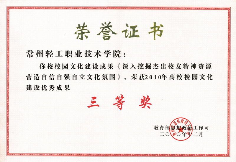 特色文化獲教育部2010年高校校園文化建設(shè)成果三等獎(證書)