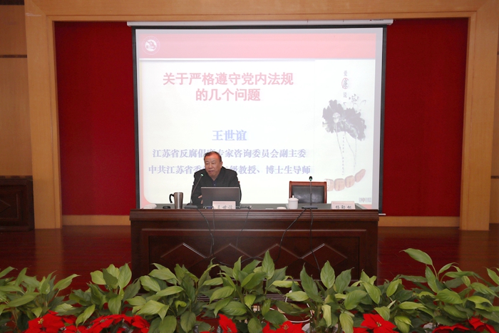11月20日下午,我院黨委中心組(擴(kuò)大)學(xué)習(xí)暨“清風(fēng)講堂”講座在教學(xué)樓3201報(bào)告廳舉行,講座邀請江蘇省委黨校教授王世誼作了題為《關(guān)于嚴(yán)格遵守黨內(nèi)法規(guī)的幾個問題》的報(bào)告,全體校領(lǐng)導(dǎo)出席,科級以上干部、各黨總支委員、各黨支部書記和支部委員、黨風(fēng)廉政建設(shè)信息聯(lián)絡(luò)員參加本次講座,講座由校長楊勁松主持。