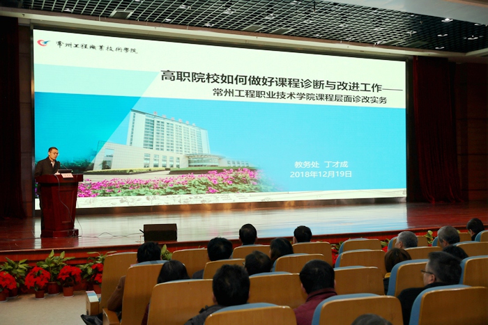 12月19日下午,我校診改高級實(shí)務(wù)研修班舉行“課程層面診改”專題報告會。邀請了常州工程職業(yè)技術(shù)學(xué)院教務(wù)處副處長丁才成作題為《用課程診改帶動教學(xué)質(zhì)量提升》的專題報告。校長楊勁松、全體中層干部及教職工參加了報告會。報告會由副校長姚慶文主持。