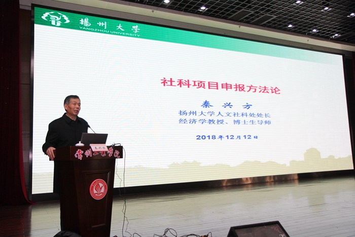 12月12日,揚州大學人文社科處處長、經濟學教授、博士生導師秦興方應邀為我校作“社科項目申報方法論”學術報告。學校黨委書記繆昌武、各二級學院院長、全體教師參加了會議,學校副院長蔣新萍主持講座。
