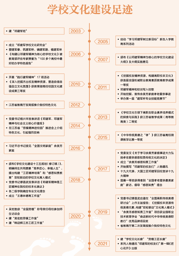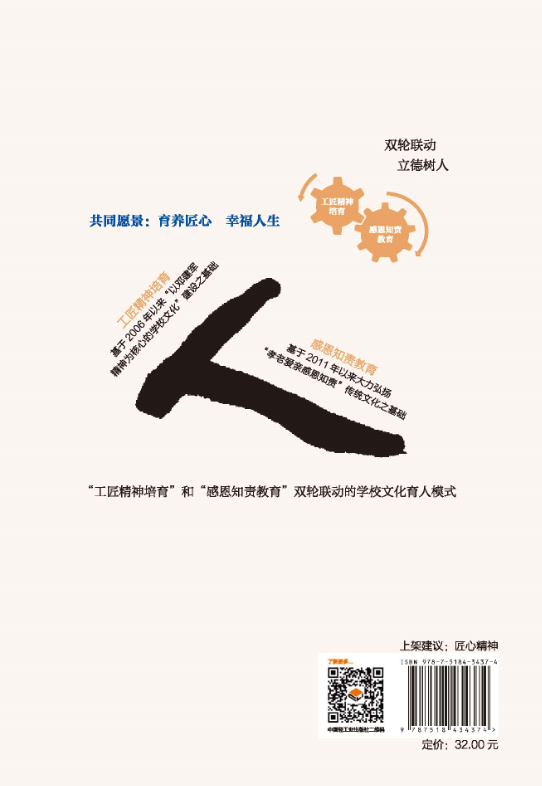 學(xué)校黨委宣傳部所屬的學(xué)校文化研究和推進(jìn)組織——鄧建軍學(xué)校文化研究會以《育養(yǎng)匠心,幸福人生——構(gòu)建 “工匠精神培育”和“感恩知責(zé)教育”雙輪聯(lián)動的學(xué)校文化育人模式》為題作序,深入介紹了我校的學(xué)校文化建設(shè)的歷程、載體和已經(jīng)取得的成效。封三位置將學(xué)校文化建設(shè)足跡列表展示。