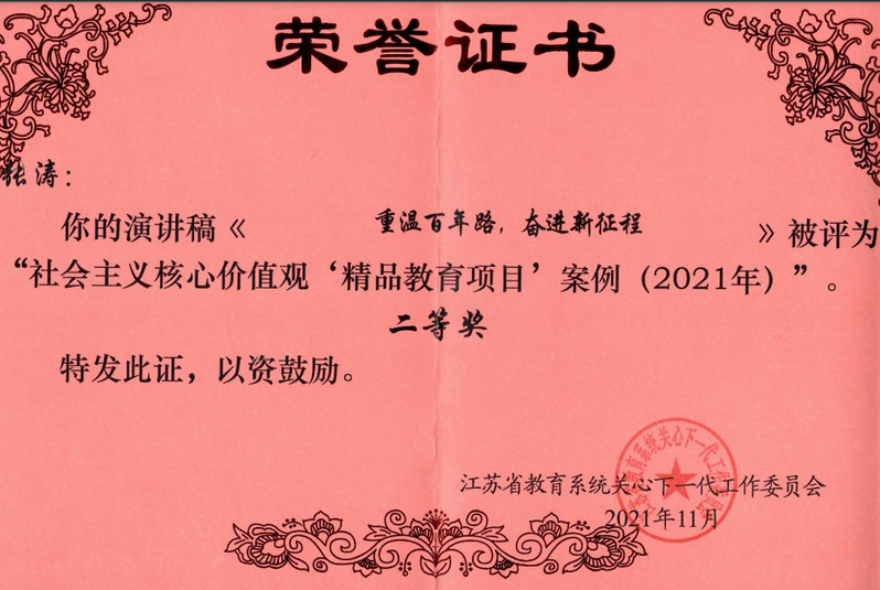 近日,江蘇省教育系統(tǒng)關(guān)心下一代工作委員會公布了“社會主義核心價值觀‘精品教育項目’案例(2021年)”評選結(jié)果(蘇教關(guān)委〔2021〕20號文),我校關(guān)工委報送的《重溫百年路,奮進(jìn)新征程》項目榮獲二等獎。