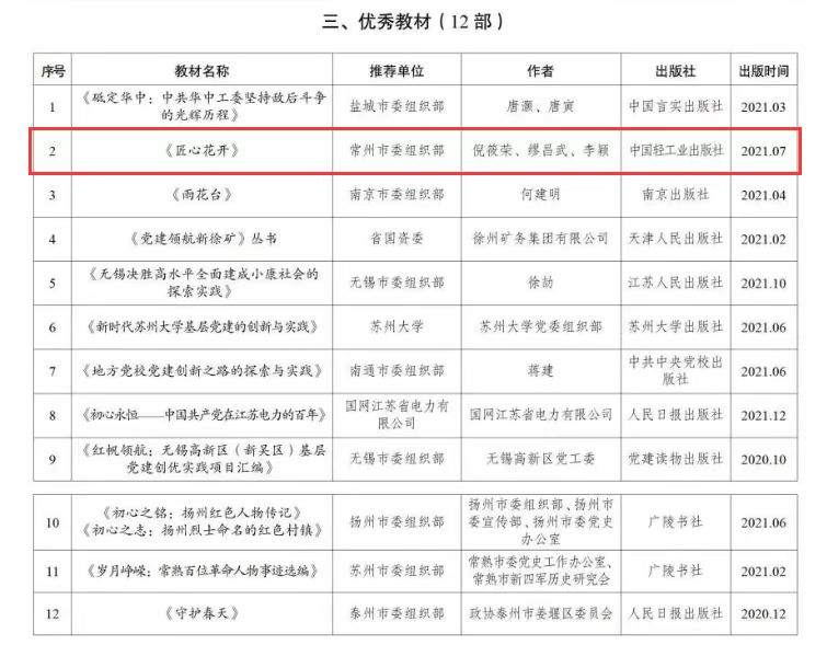 近日,江蘇省黨員教育培訓(xùn)教材展示交流活動(dòng)評(píng)選結(jié)果公布,常州市委組織部選送的兩部書籍獲獎(jiǎng),其中我校的校本文化教材《鄧建軍的校友們(第一輯)·匠心花開》獲評(píng)“優(yōu)秀教材”。