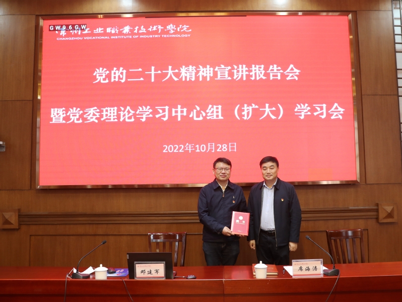 為深入學(xué)習(xí)貫徹黨的二十大精神,切實把全校上下的思想和行動統(tǒng)一到黨的二十大精神上來,掀起學(xué)習(xí)宣傳貫徹黨的二十大精神熱潮,10月28日,我校召開黨委理論學(xué)習(xí)中心組(擴大)學(xué)習(xí)會,邀請黨的二十大代表、杰出校友、新世紀(jì)全國首批“能工巧匠”、黑牡丹(集團(tuán))股份有限公司技術(shù)總監(jiān)鄧建軍回母校傳達(dá)黨的二十大精神。全體校領(lǐng)導(dǎo)、黨委委員出席會議,會議由黨委書記席海濤主持。