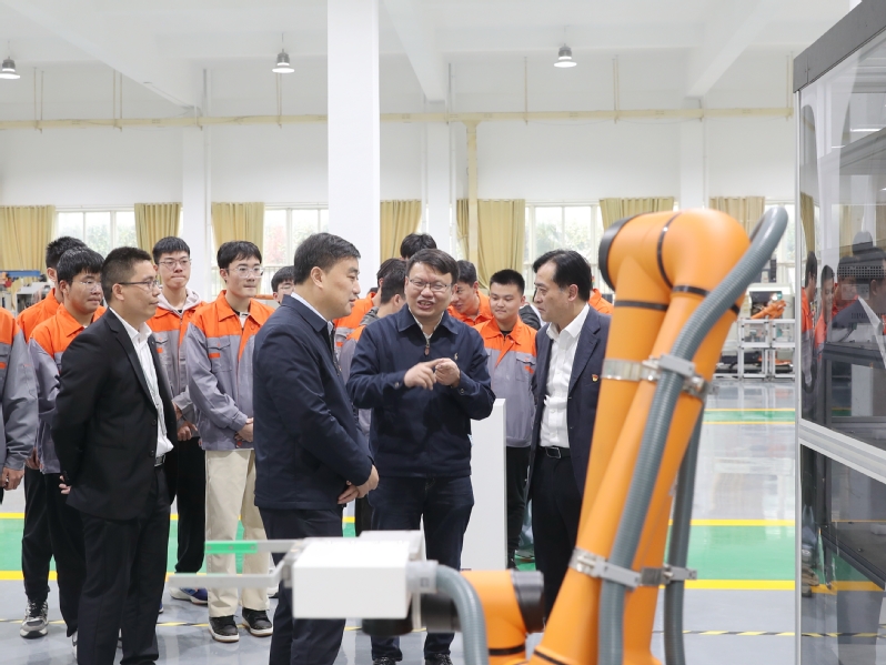 參觀過程中,鄧建軍向工程中心主任劉進(jìn)福博士詳細(xì)了解了該平臺(tái)圍繞教育機(jī)器人的系統(tǒng)架構(gòu)和整體業(yè)務(wù)流程。他表示,在奔涌向前的“智改數(shù)轉(zhuǎn)”浪潮下,黑牡丹正加速推進(jìn)“機(jī)器換人、數(shù)據(jù)換腦”的智能化改造工作,而學(xué)校虛實(shí)融合的智能制造實(shí)訓(xùn)平臺(tái)涵蓋生產(chǎn)管控軟件、智能產(chǎn)線、數(shù)字孿生三個(gè)層面,高度契合智能化工廠轉(zhuǎn)型升級(jí)的關(guān)鍵層面,對(duì)培養(yǎng)智能制造前沿產(chǎn)業(yè)的技術(shù)技能人才意義非凡。
