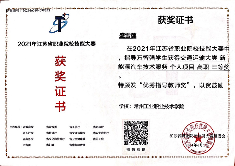 盛雪蓮老師獲得江蘇省職業(yè)院校技能大賽優(yōu)秀指導(dǎo)教師獎