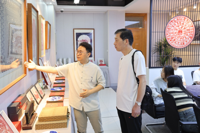 在傳統(tǒng)工藝教研室主任李斌老師的帶領(lǐng)下,張金興參觀了金壇刻紙楊兆群大師工作室,詳細了解了目前工作室活動開展、非遺課程開設(shè)、刻紙項目體驗等情況,并在講解下,欣賞了工作室?guī)熒鷦?chuàng)作的非遺金壇刻紙和紅色文創(chuàng)作品。張金興對金壇刻紙作品中蘊含的精湛技藝和豐富的文化內(nèi)涵表示贊賞,并對學(xué)生參與到非遺技藝的學(xué)習(xí)和體驗,繼承和發(fā)揚中華優(yōu)秀傳統(tǒng)文化表示高度肯定。參觀結(jié)束后,張金興還以“傳承非遺匠心,堅定文化自信”為題,為同學(xué)們開展了一場精彩的新思想公開課。講座中,張金興老師鼓勵同學(xué)們繼續(xù)傳承和弘揚中華優(yōu)秀傳統(tǒng)文化,堅定文化自信,充分發(fā)揮自己的專業(yè)特長,努力學(xué)習(xí)和傳承金壇刻紙技藝,為中華文化的傳承和發(fā)展貢獻自己的力量。