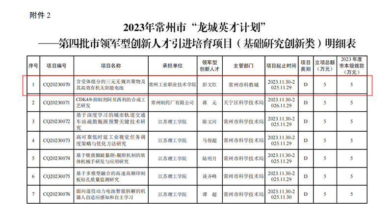 近日,中共常州市委人才工作領(lǐng)導(dǎo)小組辦公室,常州市科學(xué)技術(shù)局印發(fā)了《關(guān)于下達(dá)2023年常州市“龍城英才計劃”第四批市領(lǐng)軍型創(chuàng)新人才引進(jìn)培育項目(基礎(chǔ)研究創(chuàng)新類)的通知》(??瓢l(fā)〔2023〕198 號),我校材料工程學(xué)院彭文紅博士的項目《含受體組分的三元無規(guī)共聚物及其高效有機太陽能電池》入選基礎(chǔ)研究創(chuàng)新類項目。全市高職院校僅我校入選項目1項。