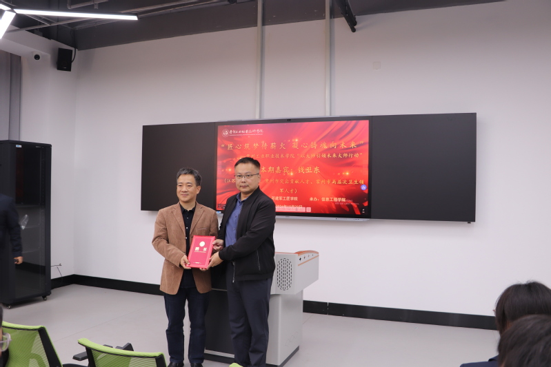鄧建軍工匠學院院長袁飛為錢衛(wèi)東頒發(fā)了“以大師引領未來大師行動”師徒結對導師聘書。
