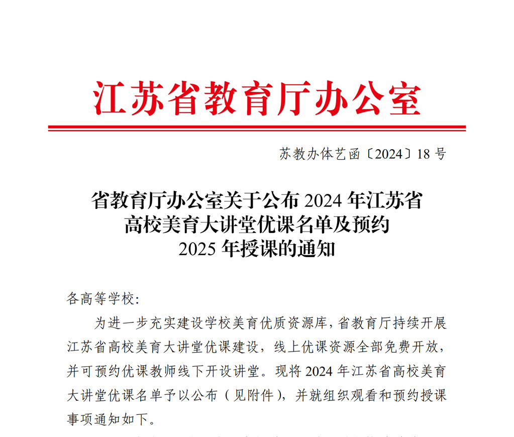 江蘇省美育大講堂優(yōu)課評選由江蘇省教育廳主辦,旨在貫徹落實(shí)省委辦公廳、省政府辦公廳印發(fā)的《關(guān)于全面加強(qiáng)和改進(jìn)新時代學(xué)校美育工作的實(shí)施意見》,鼓勵高校以審美和人文素養(yǎng)培養(yǎng)為核心、以創(chuàng)新能力培育為重點(diǎn)、以中華優(yōu)秀傳統(tǒng)文化傳承發(fā)展和藝術(shù)經(jīng)典教育為主要內(nèi)容,面向全體學(xué)生開展美育普及教育,充分融合和推廣江蘇高校美育資源。