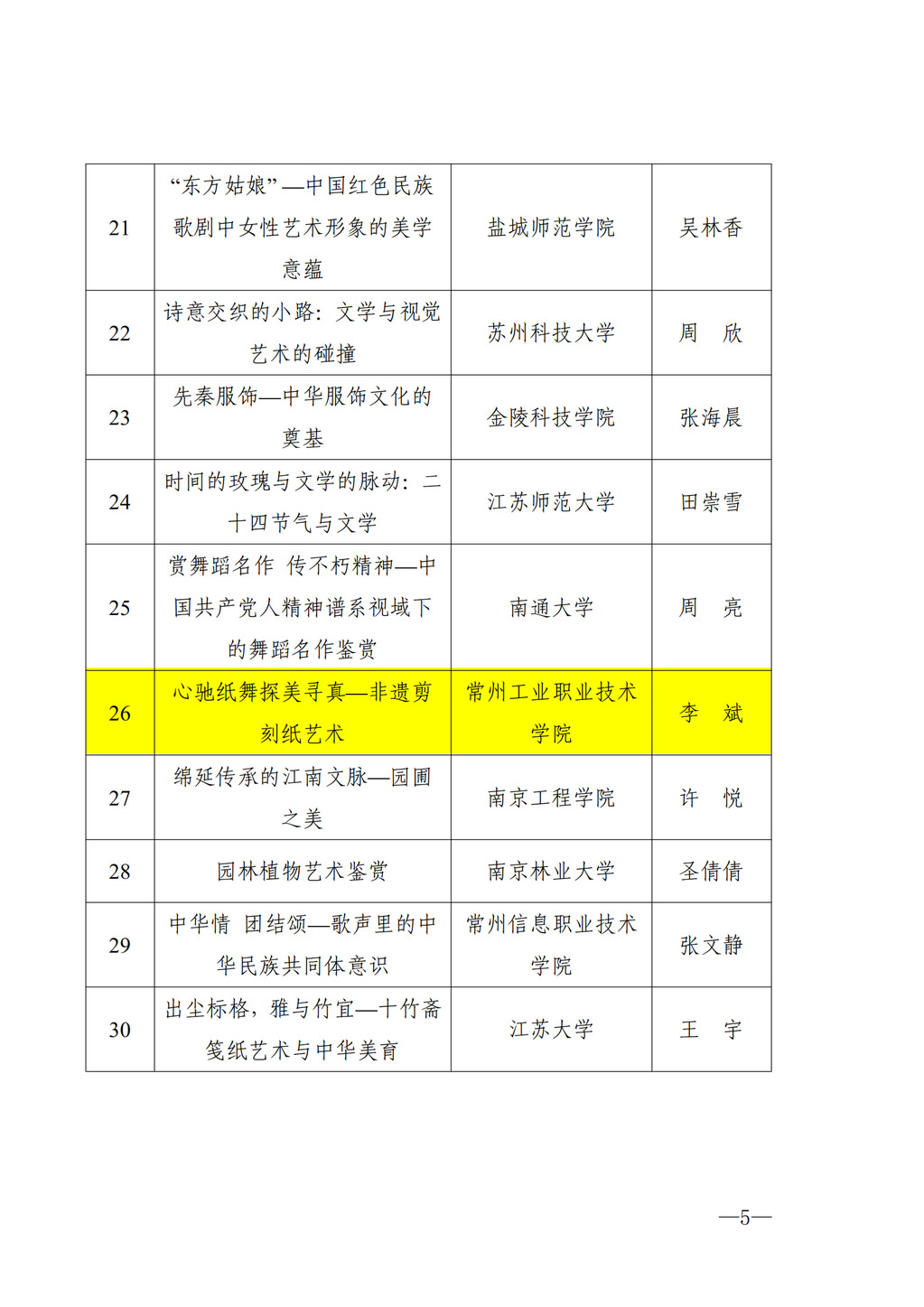 近日,江蘇省教育廳公布《省教育廳辦公室關(guān)于公布2024年江蘇省高校美育大講堂優(yōu)課名單及預(yù)約2025年授課的通知》(蘇教辦體藝函〔2024〕18號),我校報(bào)送的課程《心馳紙舞探美尋真—非遺剪刻紙藝術(shù)》成功入選。本次優(yōu)課評選,全省本專科院校共提交154門課程參評,經(jīng)省教育廳組織省外專家初評、復(fù)評,最終遴選出30門課程為2024年江蘇省高校美育大講堂優(yōu)課。