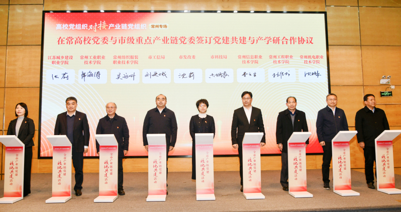 席海濤與常州市委教育工委書記司馬雙龍、其他在常高校黨委書記共同發(fā)布“強基固鏈·校地融合”戰(zhàn)略合作倡議,并與常州市發(fā)改委、工信局、科技局等市級產(chǎn)業(yè)鏈牽頭部門負責人簽訂合作協(xié)議。