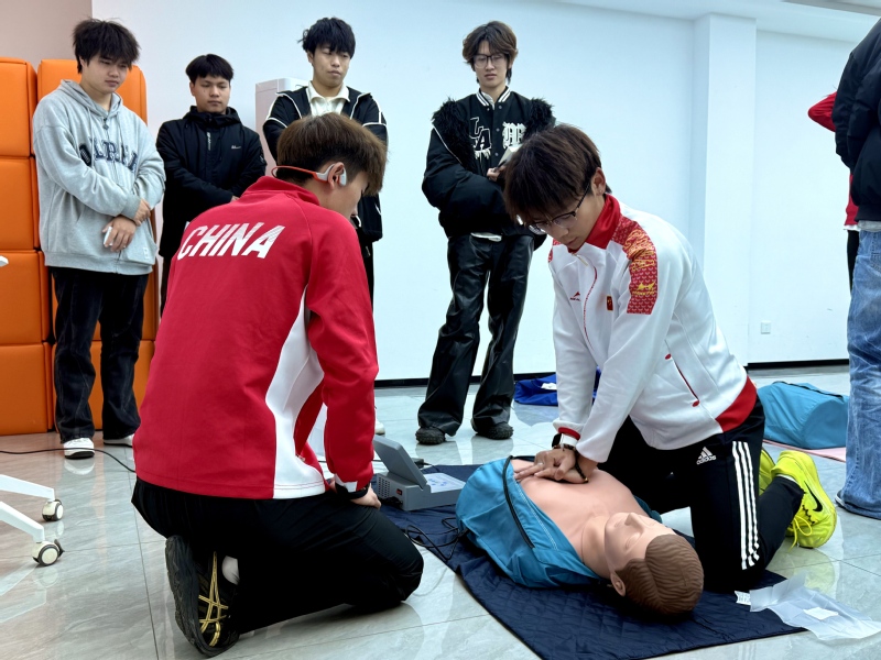 “胸外按壓的深度必須達(dá)到5厘米,就像按下生命的‘重啟鍵’。”培訓(xùn)伊始,休閑體育專業(yè)學(xué)生講師夏文德、王苗苗和馮青彪分別模擬現(xiàn)場情景,將操作動(dòng)作分解,分批次為樓層長講解基礎(chǔ)生命支持(BLS)的核心邏輯。他們從判斷意識(shí)、呼救報(bào)警到胸外按壓的深度頻率,從開放氣道的標(biāo)準(zhǔn)動(dòng)作、AED電極片的精準(zhǔn)貼附到恢復(fù)生命體征后的人文關(guān)懷,每個(gè)步驟均拆解為可量化、可復(fù)制的科學(xué)流程。酒店管理與數(shù)字化運(yùn)營專業(yè)的徐曦遠(yuǎn)感慨:“當(dāng)模擬人‘恢復(fù)心跳’的提示音響起時(shí),我真實(shí)感受到技能托起生命的重量?!?/p>