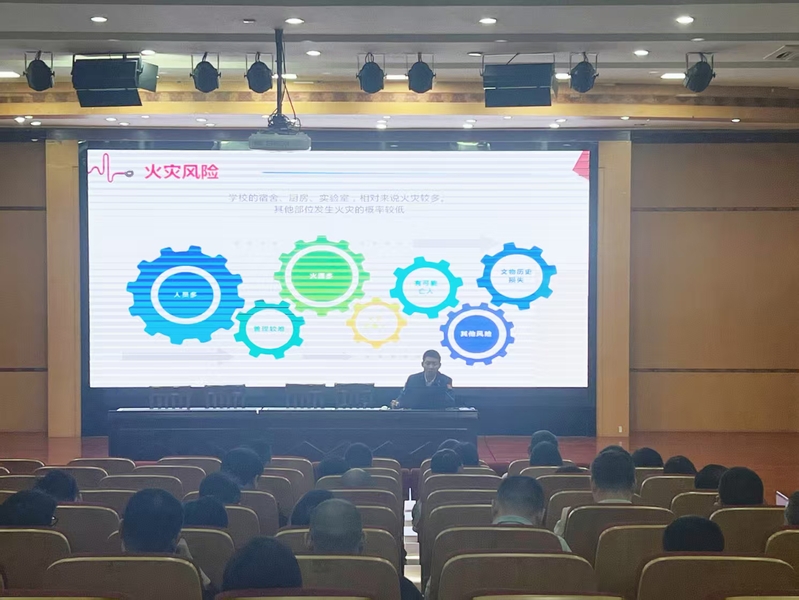 活動分兩個環(huán)節(jié)進行。首先,滕振結合校園火災實例,為教職工開展消防安全知識講座,詳盡闡述了火災成因、預防策略、種類區(qū)分及逃生技巧,并著重強調(diào)了消防安全“三知四會”:知火險、知器材、知通道;會報警、會使用、會撲救、會疏散。他詳細講解了干粉滅火器、二氧化碳滅火器、泡沫滅火器、滅火毯等消防設備的使用場景、操作規(guī)范及滅火技巧。