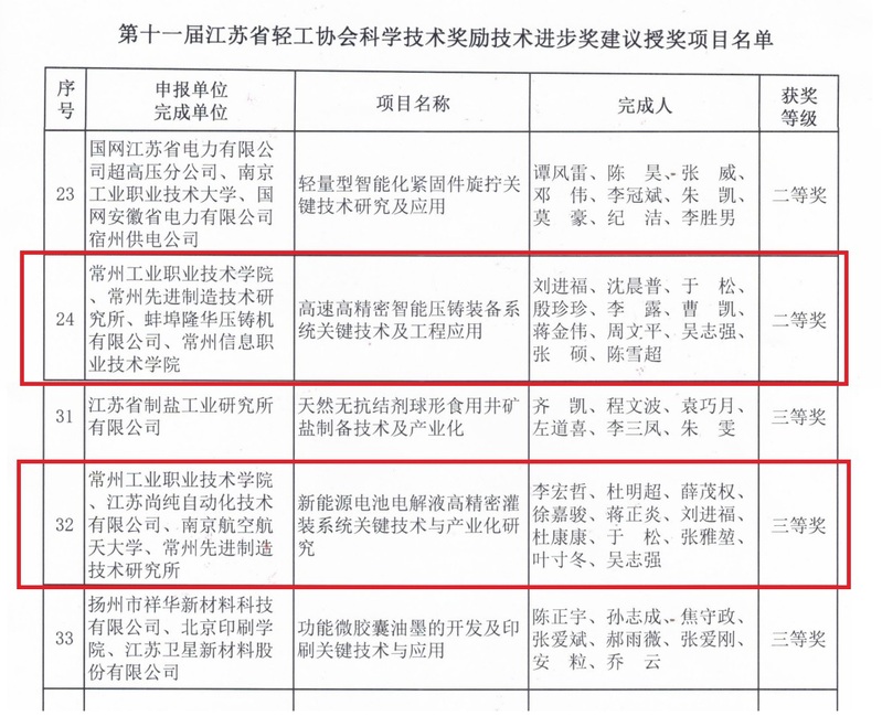 由我校和常州先進(jìn)制造技術(shù)研究所、蚌埠隆華壓鑄機(jī)有限公司、常州信息職業(yè)技術(shù)學(xué)院聯(lián)合申報(bào)完成,我校劉進(jìn)福、沈晨普、于松、蔣金偉、張碩等人主要完成的《高速高精密智能壓鑄裝備系統(tǒng)關(guān)鍵技術(shù)及工程應(yīng)用》獲技術(shù)進(jìn)步獎(jiǎng)二等獎(jiǎng);由我校和江蘇尚純自動(dòng)化技術(shù)有限公司、南京航空航天大學(xué)、常州先進(jìn)制造技術(shù)研究所聯(lián)合申報(bào)完成,我校李宏哲、薛茂權(quán)、蔣正炎、劉進(jìn)福、杜康康、于松等人主要完成的《新能源電池電解液高精密灌裝系統(tǒng)關(guān)鍵技術(shù)與產(chǎn)業(yè)化研究》獲技術(shù)進(jìn)步獎(jiǎng)三等獎(jiǎng)。