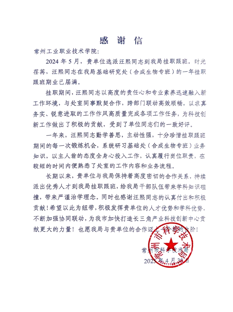 近日,我校收到常州市科技局發(fā)來的感謝信,感謝我校長(zhǎng)期以來對(duì)市科技局工作的大力支持,并表揚(yáng)我校派出教師汪熙在掛職工作期間的優(yōu)異表現(xiàn)和積極貢獻(xiàn)。