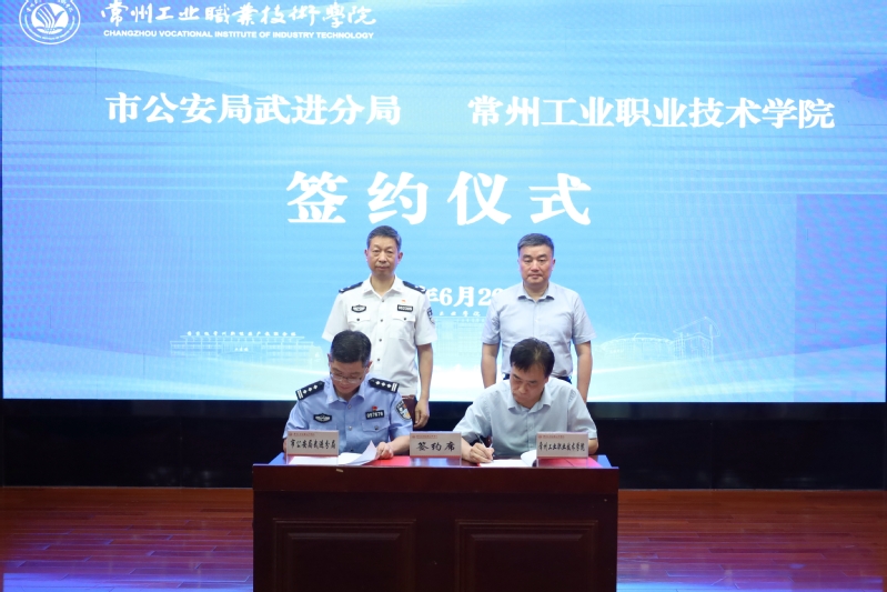 6月26日,由我校與常州市公安局武進分局共建的武進輔警學院揭牌成立。常州市武進區(qū)副區(qū)長、常州市公安局武進分局局長盛世麟、政委韓云峰,我校黨委書記席海濤,黨委副書記、校長楊勁松出席簽約儀式。儀式由黨委委員、副校長吳麗云主持。