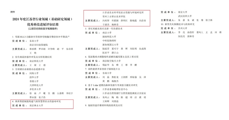 近日,江蘇省科協(xié)公布了“2024年度江蘇省行業(yè)領(lǐng)域十大科技進(jìn)展”成果名單。由我校材料工程學(xué)院于涌杰博士(2025年江蘇省“青藍(lán)工程”中青年學(xué)術(shù)帶頭人)聯(lián)合南京林業(yè)大學(xué)、江蘇省農(nóng)科院申報(bào)的“納米鐵肥賦能構(gòu)建氣候智慧型農(nóng)業(yè)的基礎(chǔ)研究”入選“2024年度江蘇省行業(yè)領(lǐng)域(基礎(chǔ)研究領(lǐng)域)十大科技進(jìn)展”,并榮獲優(yōu)秀科技進(jìn)展。該成果是繼團(tuán)隊(duì)獲批國(guó)家自然科學(xué)基金面上項(xiàng)目及在《Nature Sustainability》發(fā)表開創(chuàng)性論文后的又一重大突破。