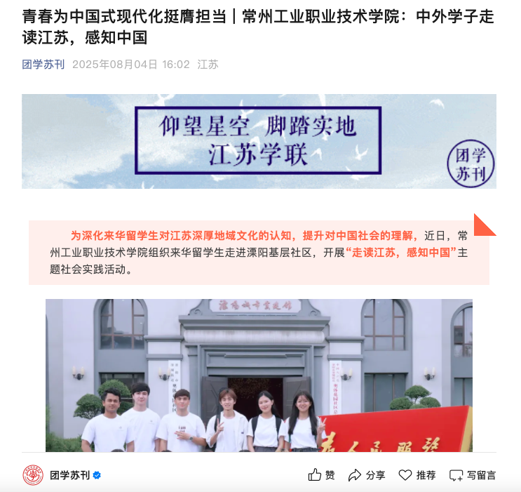 團(tuán)學(xué)蘇刊:青春為中國式現(xiàn)代化挺膺擔(dān)當(dāng) | 常州工業(yè)職業(yè)技術(shù)學(xué)院:中外學(xué)子走讀江蘇,感知中國