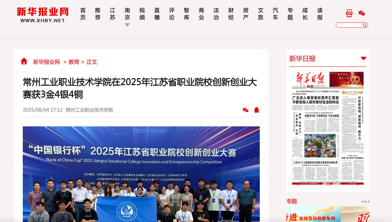 新華報業(yè)網(wǎng):常州工業(yè)職業(yè)技術(shù)學(xué)院在2025年江蘇省職業(yè)院校創(chuàng)新創(chuàng)業(yè)大賽獲3金4銀4銅
