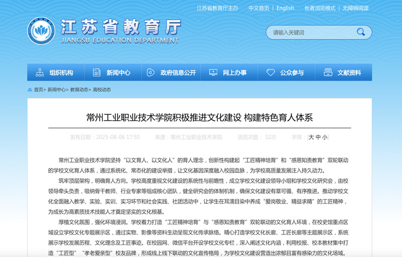 江蘇省教育廳:常州工業(yè)職業(yè)技術(shù)學(xué)院積極推進文化建設(shè) 構(gòu)建特色育人體系