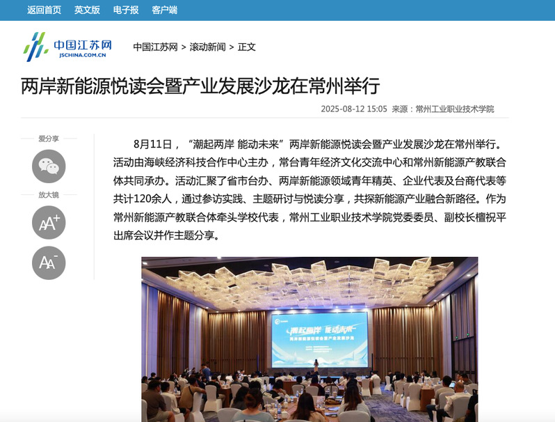 中國江蘇網(wǎng):兩岸新能源悅讀會暨產(chǎn)業(yè)發(fā)展沙龍在常州舉行