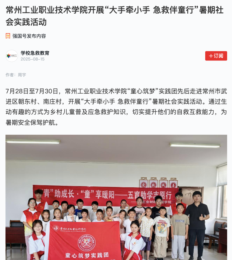 學(xué)習(xí)強國:常州工業(yè)職業(yè)技術(shù)學(xué)院開展“大手牽小手 急救伴童行”暑期社會實踐活動