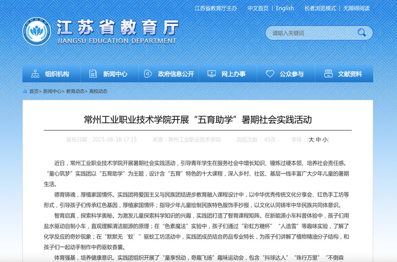 江蘇省教育廳:常州工業(yè)職業(yè)技術(shù)學(xué)院開展“五育助學(xué)”暑期社會實(shí)踐活動