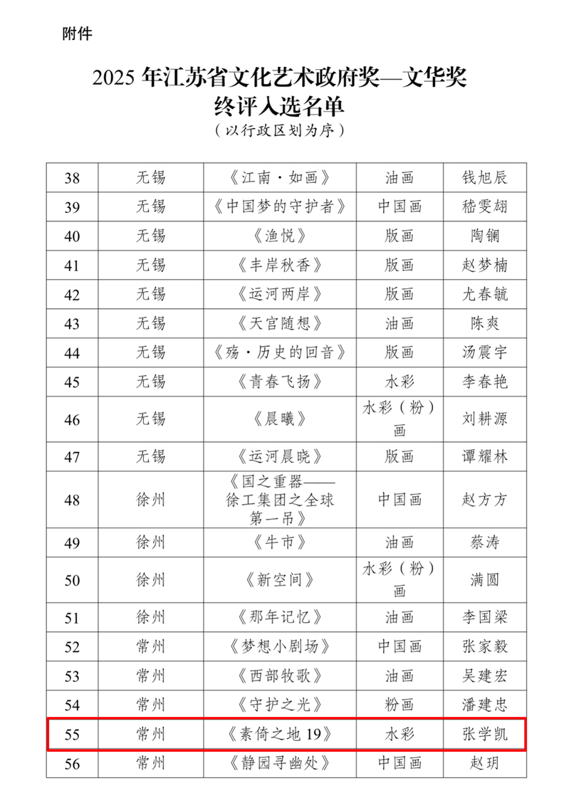 近日,由江蘇省文化和旅游廳、江蘇省人力資源和社會保障廳聯(lián)合主辦的2025年江蘇省文化藝術(shù)政府獎——文華獎入選名單公布,我校藝術(shù)創(chuàng)意學(xué)院張學(xué)凱老師創(chuàng)作的水彩畫作品《素倚之地19》成功入選。