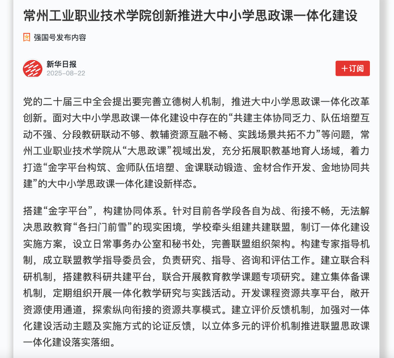 學(xué)習(xí)強(qiáng)國(guó):常州工業(yè)職業(yè)技術(shù)學(xué)院創(chuàng)新推進(jìn)大中小學(xué)思政課一體化建設(shè)