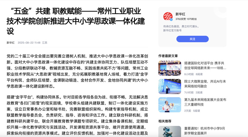 新華紅:“五金”共建 職教賦能——常州工業(yè)職業(yè)技術(shù)學(xué)院創(chuàng)新推進(jìn)大中小學(xué)思政課一體化建設(shè)