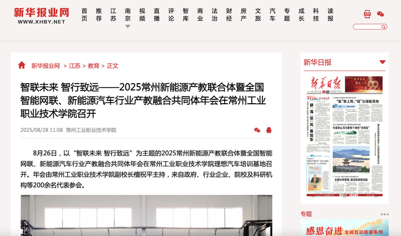 新華報(bào)業(yè)網(wǎng):2025常州新能源產(chǎn)教聯(lián)合體暨全國(guó)智能網(wǎng)聯(lián)、新能源汽車行業(yè)產(chǎn)教融合共同體年會(huì)在常州工業(yè)職業(yè)技術(shù)學(xué)院召開(kāi)