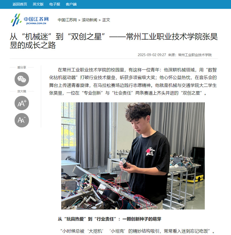 中國江蘇網:從“機械迷”到“雙創(chuàng)之星”——常州工業(yè)職業(yè)技術學院張昊昱的成長之路