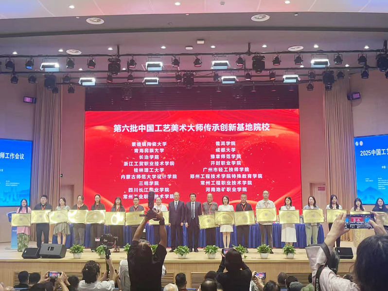 9月22日,2025中國工藝美術(shù)大師工作會議在浙江溫州召開。本次會議由中國輕工業(yè)聯(lián)合會主辦,匯聚全國300余名工藝美術(shù)大師、行業(yè)專家及院校代表,以“弘揚大師精神,奮進工美事業(yè)”為核心,共探傳統(tǒng)工藝傳承創(chuàng)新路徑。會上,我校獲評“中國工藝美術(shù)大師傳承創(chuàng)新基地院校”,標志著學(xué)校在非遺技藝育人與產(chǎn)業(yè)協(xié)同領(lǐng)域再獲國家級認可。藝術(shù)創(chuàng)意學(xué)院院長肖新華受邀發(fā)表主題演講,深度分享學(xué)院在紫砂工藝傳承與創(chuàng)新領(lǐng)域的實踐成果。