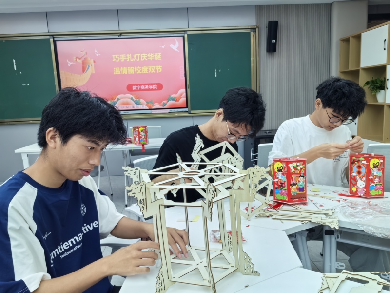 此外,旅游與康養(yǎng)學(xué)院將關(guān)懷直接送至學(xué)生社區(qū)。黨總支副書記郭媛帶領(lǐng)學(xué)工團隊走進“一站式”社區(qū)的“旅途會客廳”,與留校學(xué)生圍坐交流,隨后更深入宿舍,實地了解同學(xué)們的住宿環(huán)境與生活保障,親切詢問“宿舍還住得習(xí)慣嗎?”“學(xué)習(xí)上有沒有困難?”,將深切關(guān)懷送至每一位學(xué)子身邊。數(shù)字商務(wù)學(xué)院精心組織了“巧手扎燈慶華誕,溫情留校度雙節(jié)”主題活動。在輔導(dǎo)員的指導(dǎo)下,留校學(xué)生們親手制作燈籠,繪制五星紅旗,書寫美好寄語。一盞盞點亮的手工燈籠,不僅鍛煉了學(xué)生的動手能力,更成為了一堂生動的傳統(tǒng)文化實踐課,讓學(xué)子在體驗中紓解鄉(xiāng)愁,凝聚家國情懷。